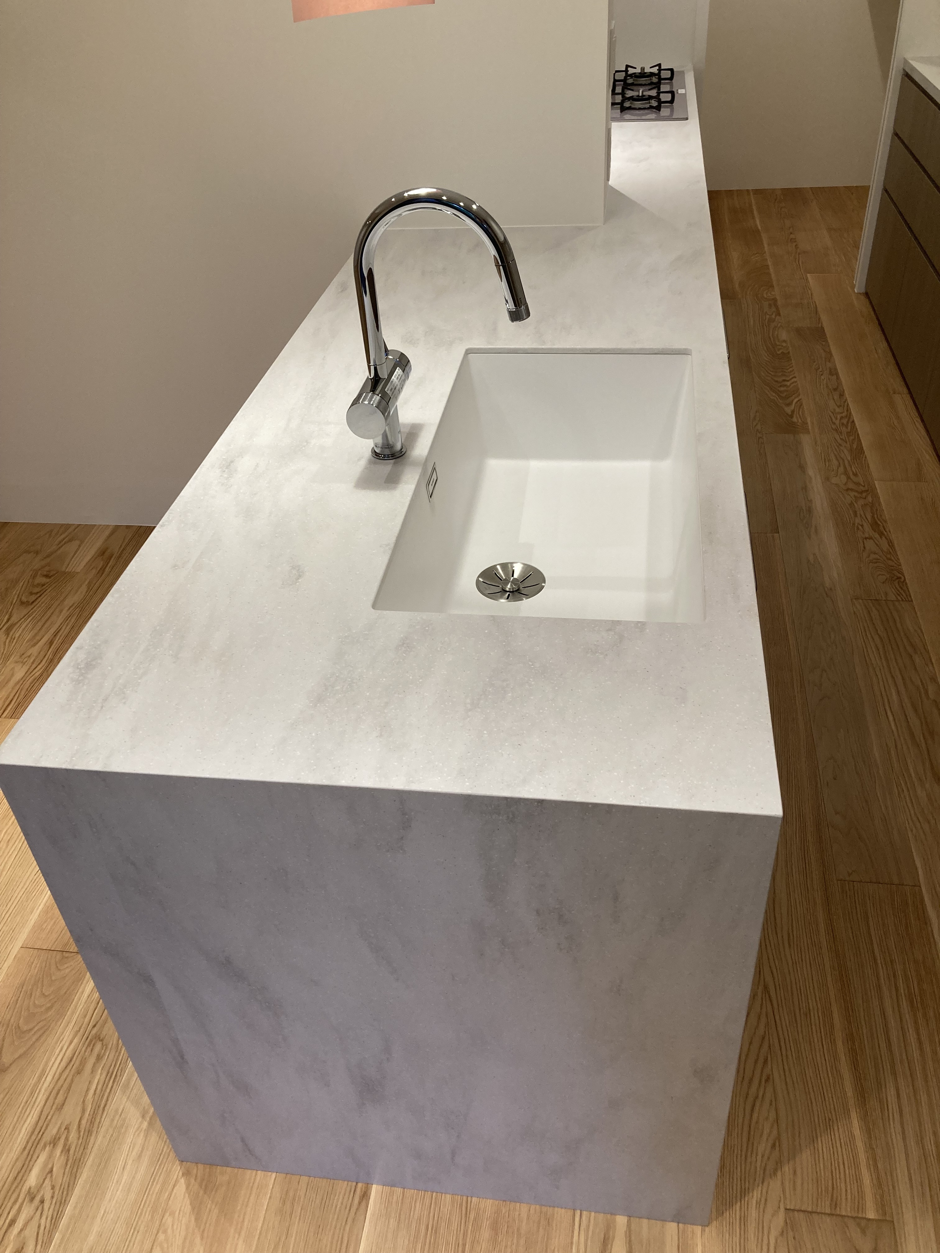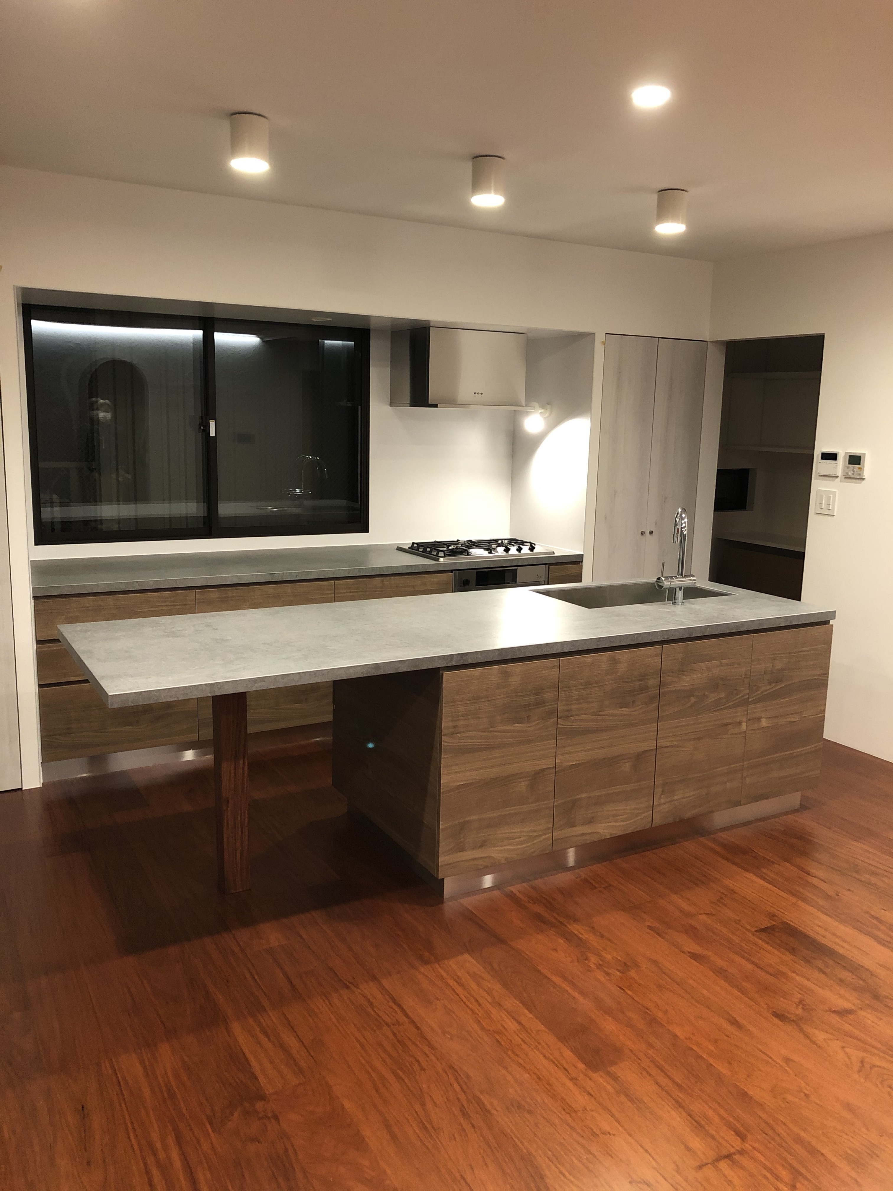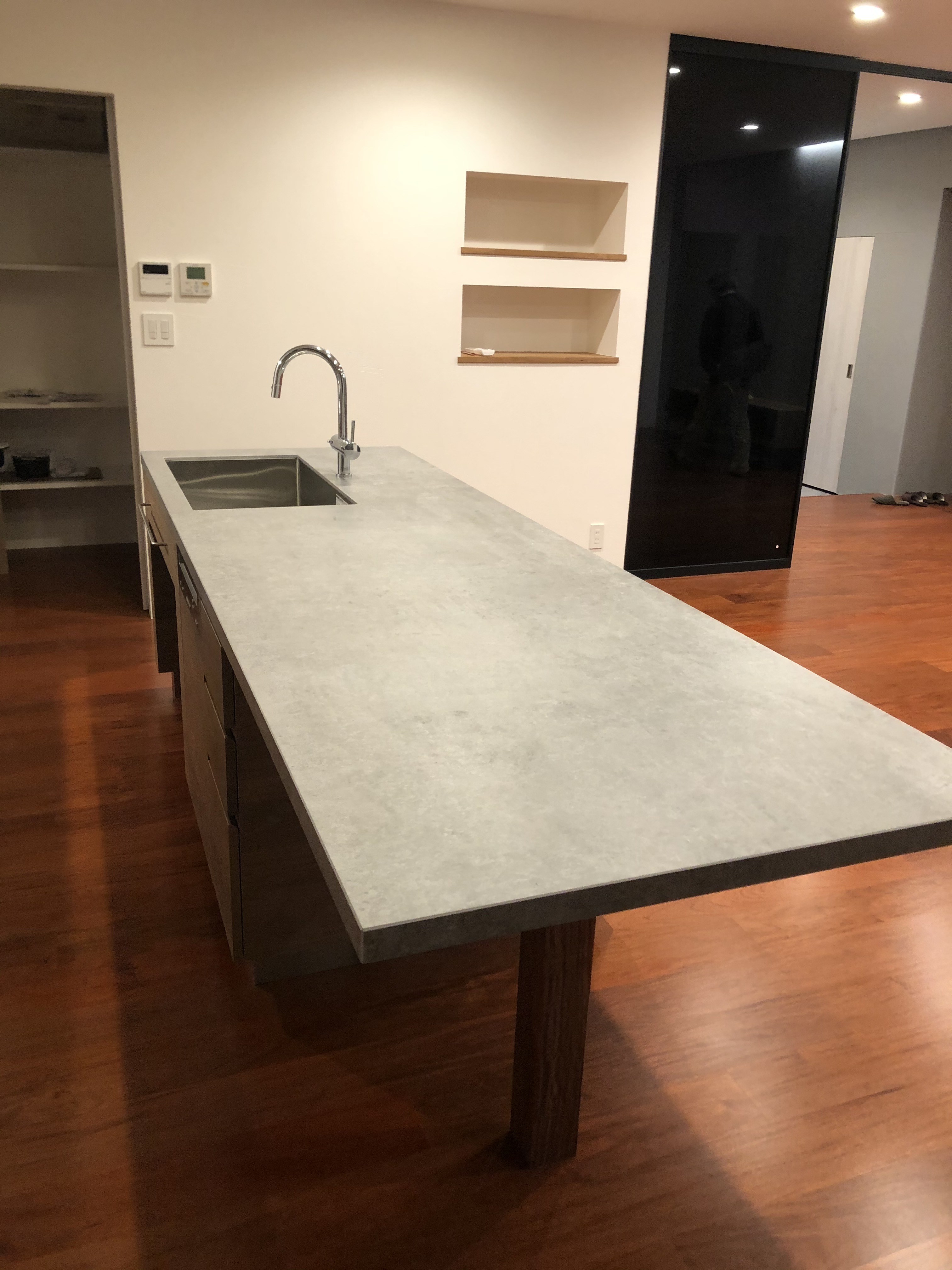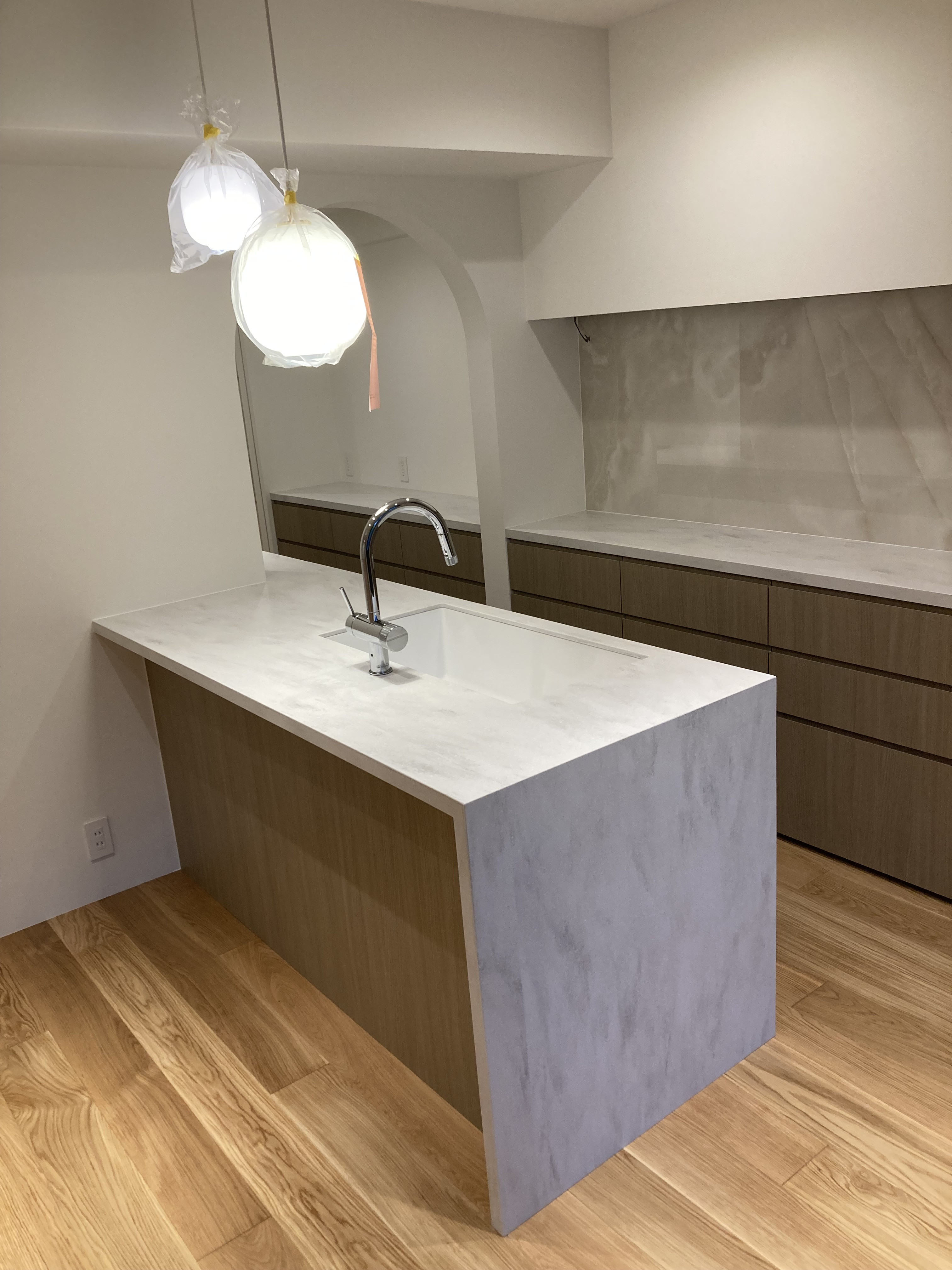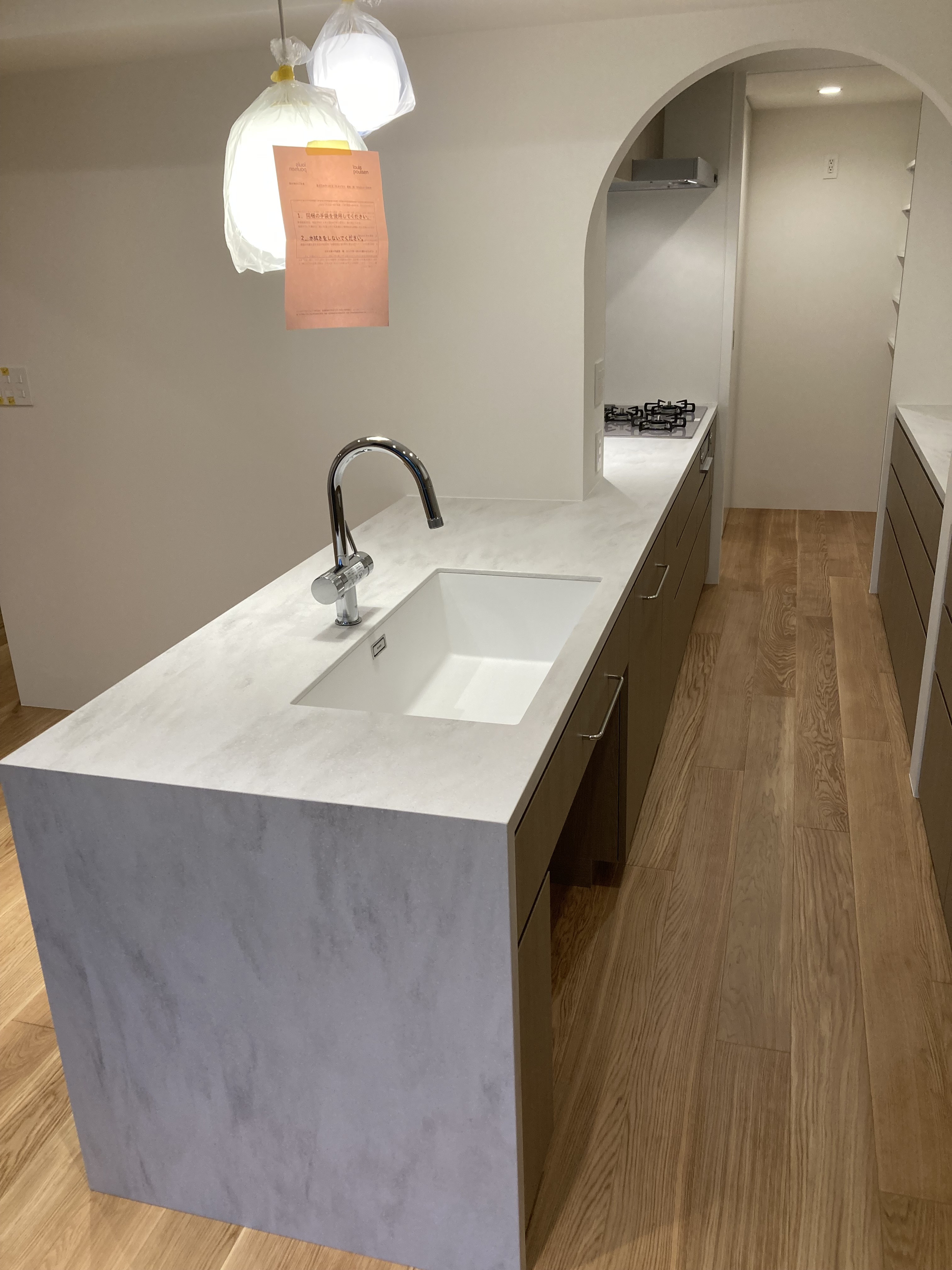 石目調の人造大理石で明るく清潔感のあるアイランドキッチン