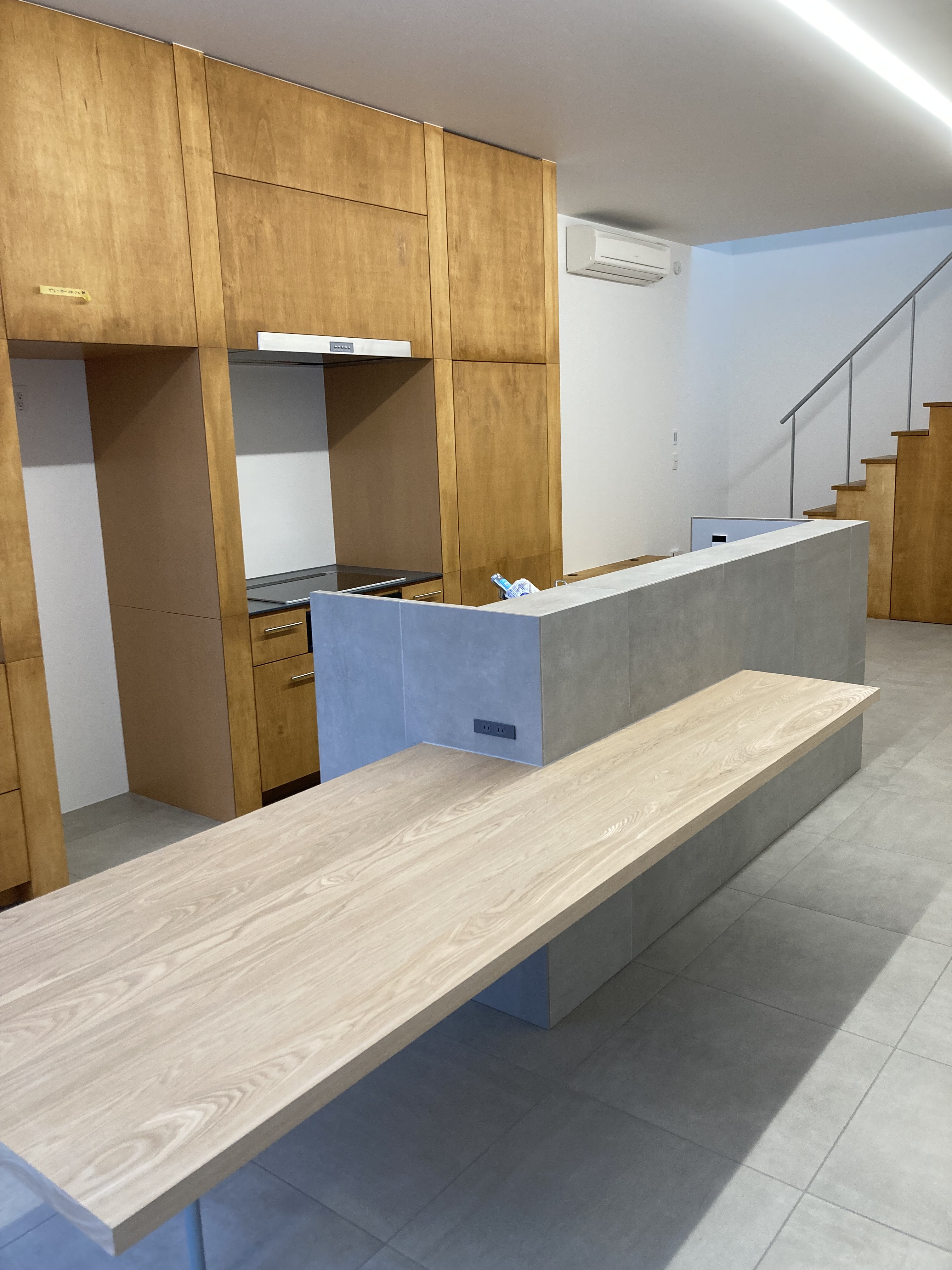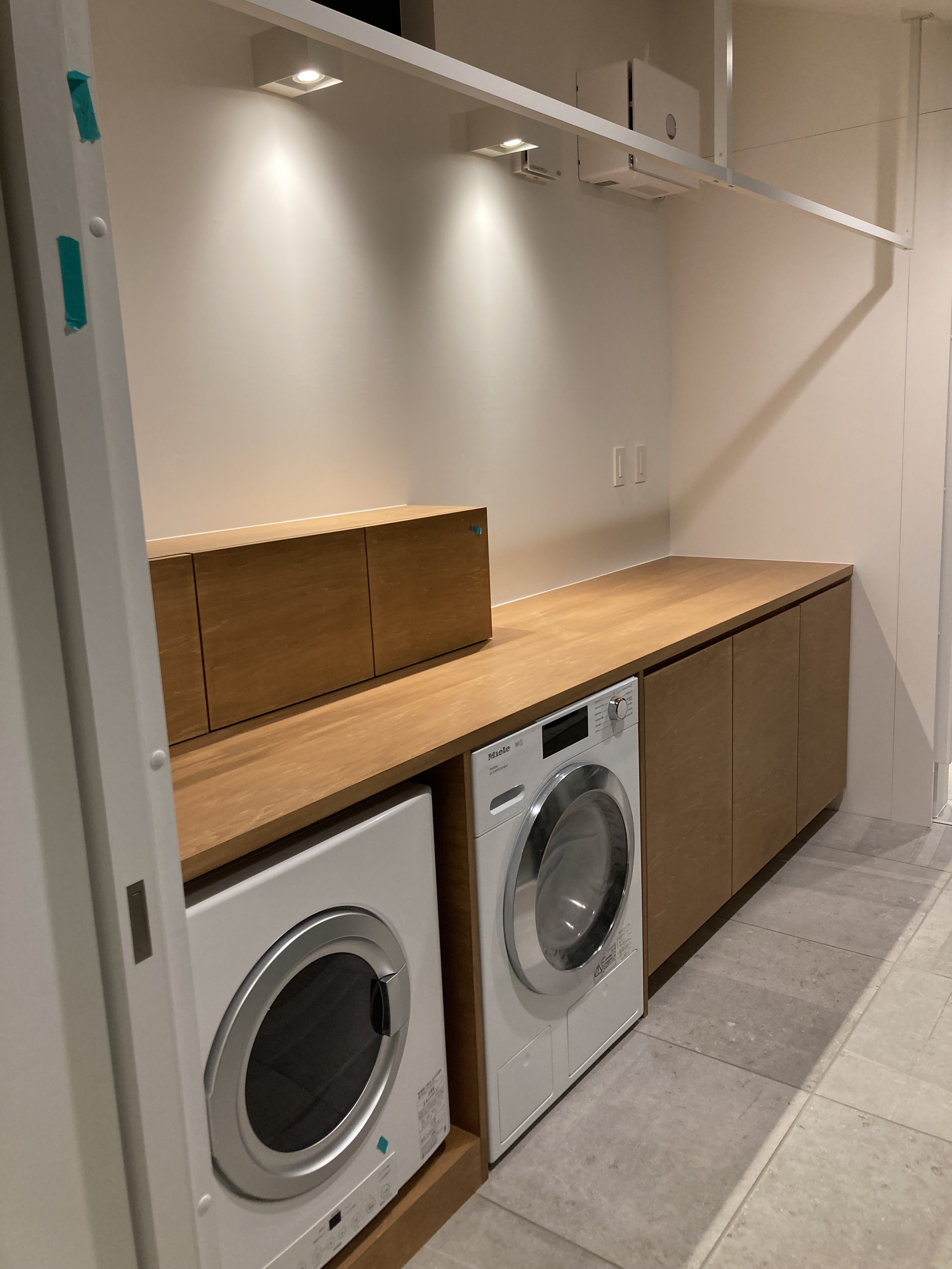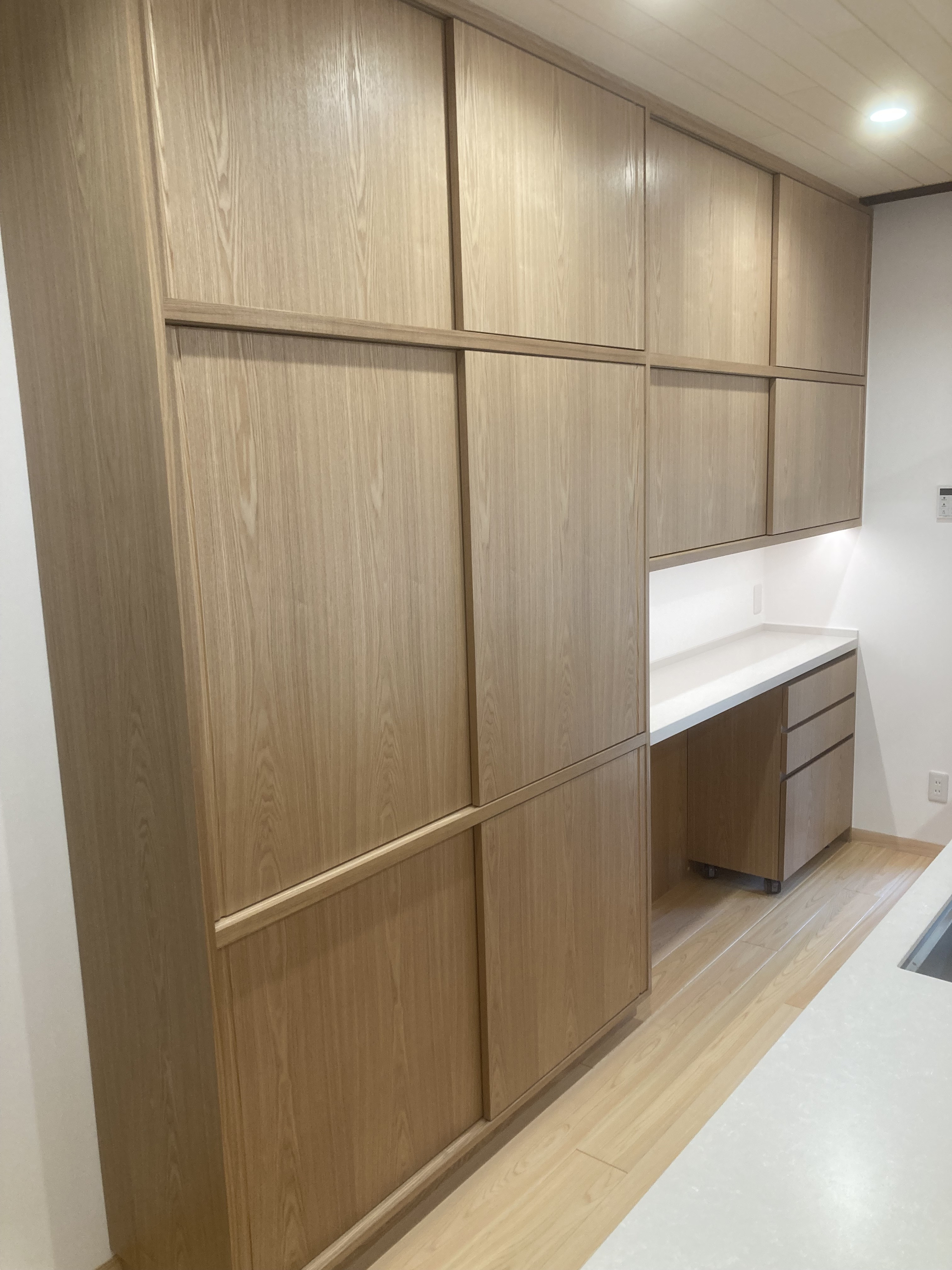 フラットな壁面収納と一体型のダイニングテーブルがあるキッチン