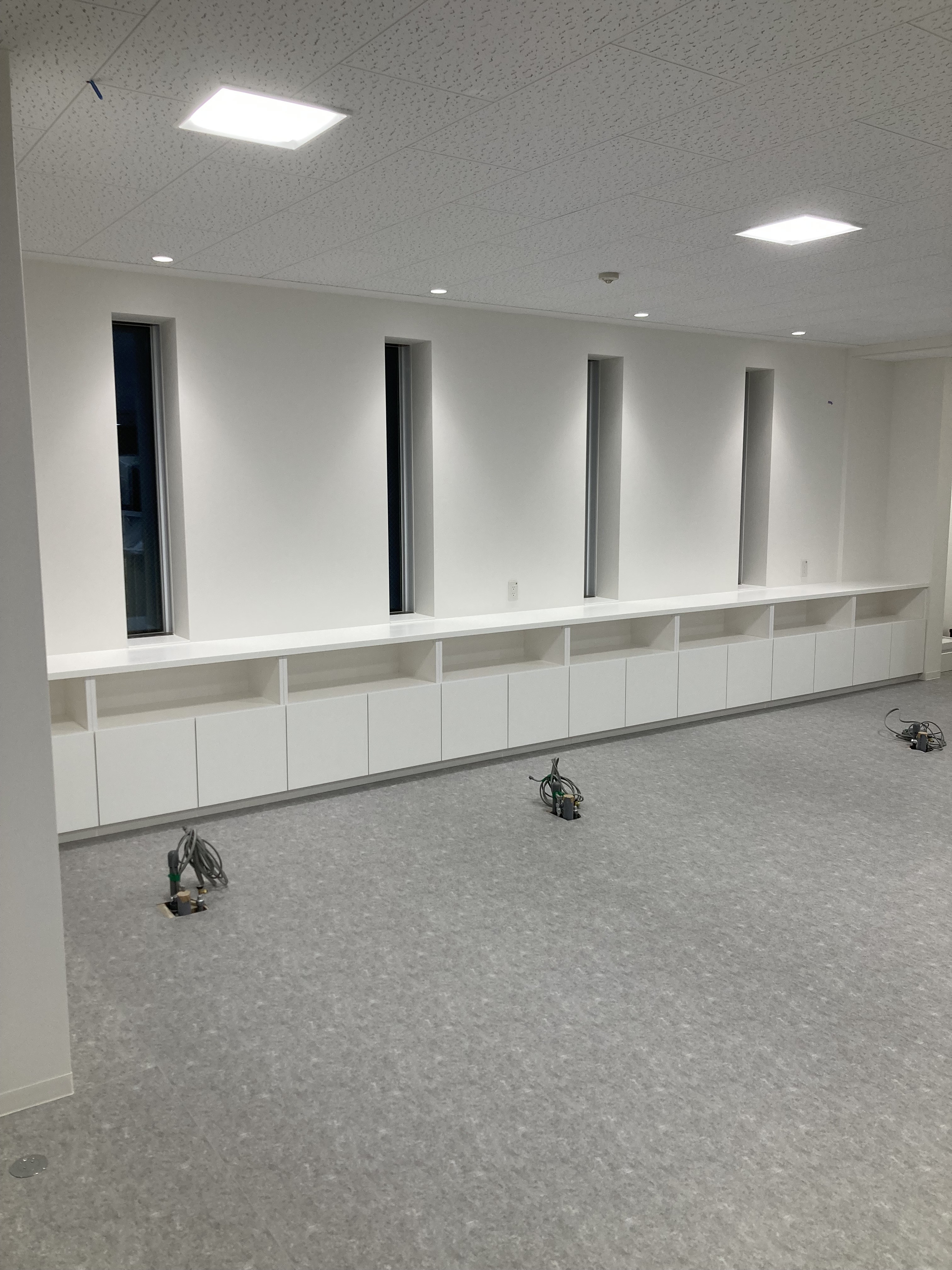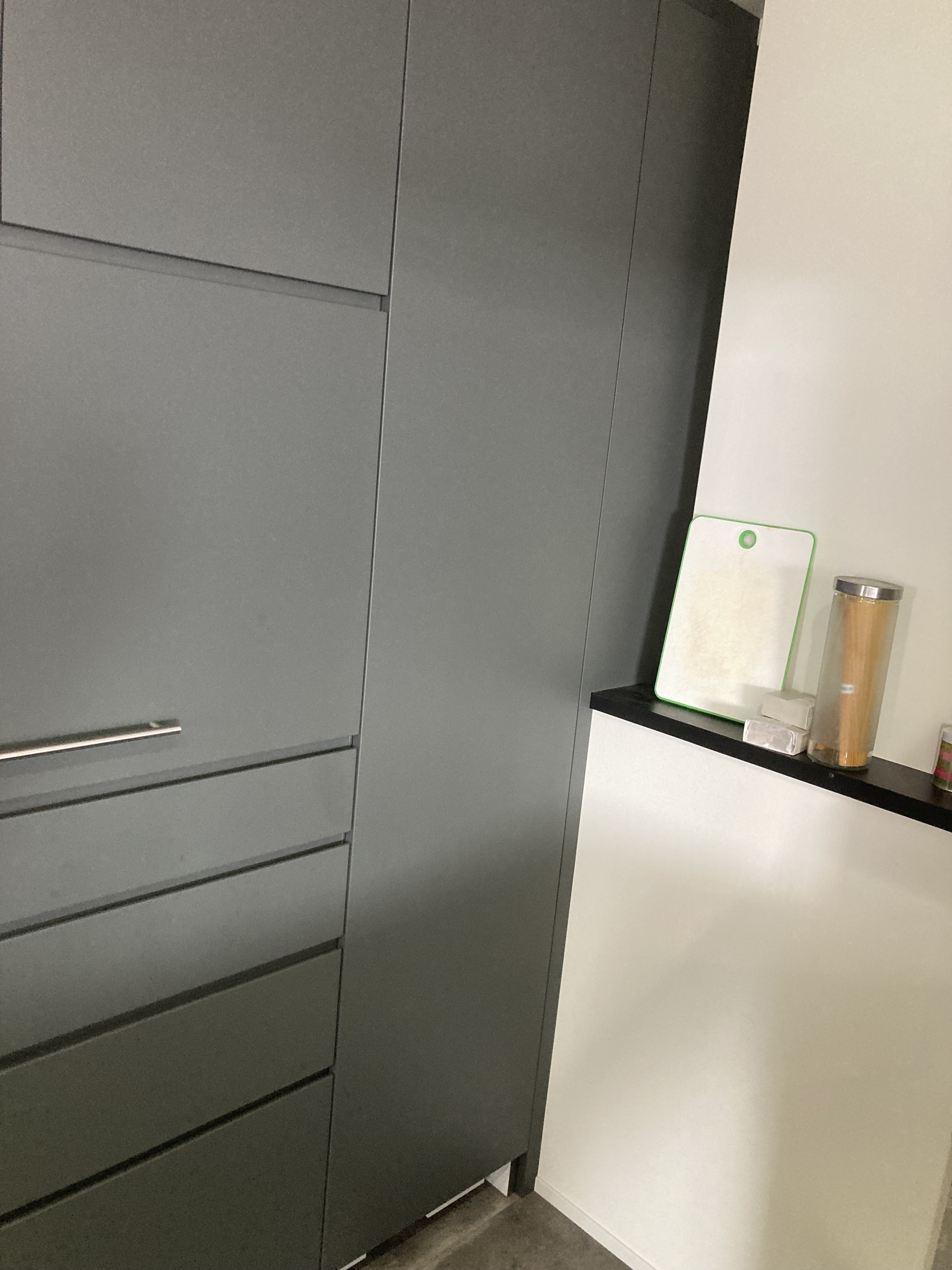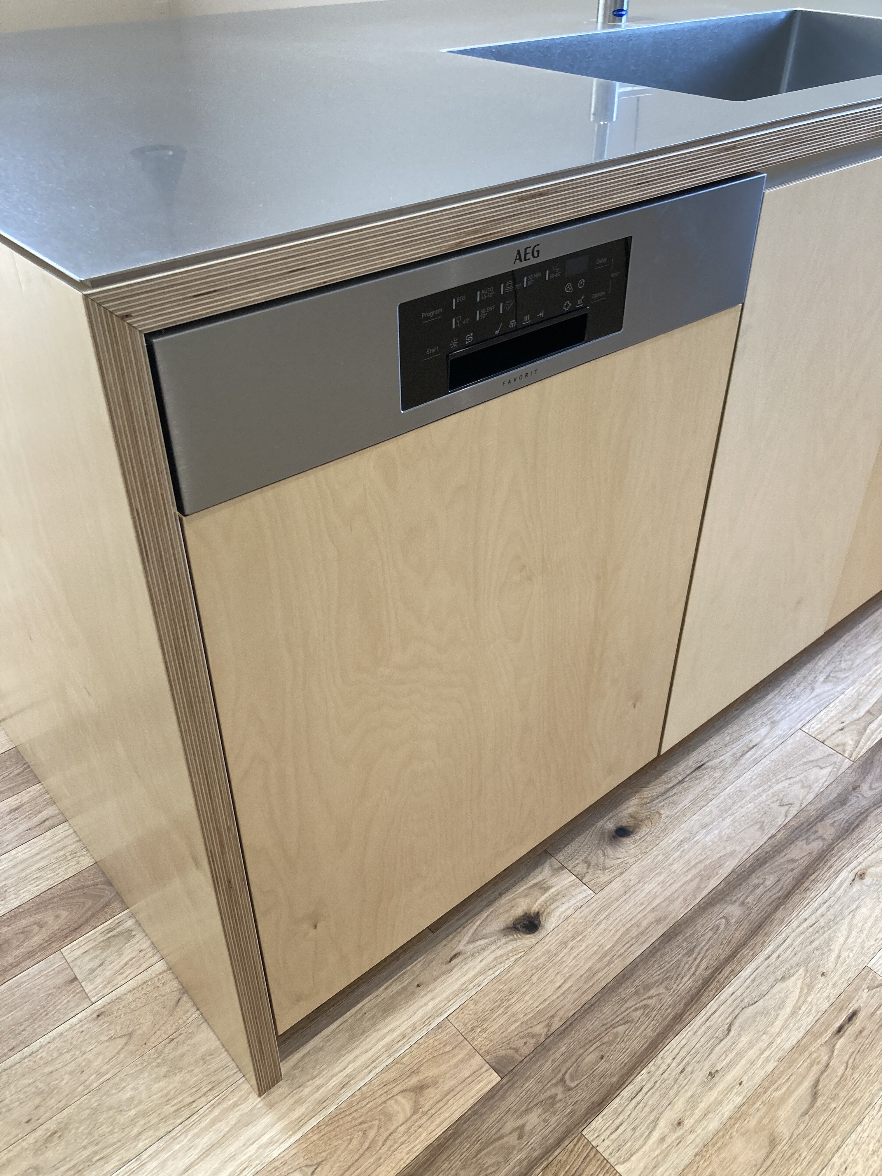 フラットな壁面収納と一体型のダイニングテーブルがあるキッチン