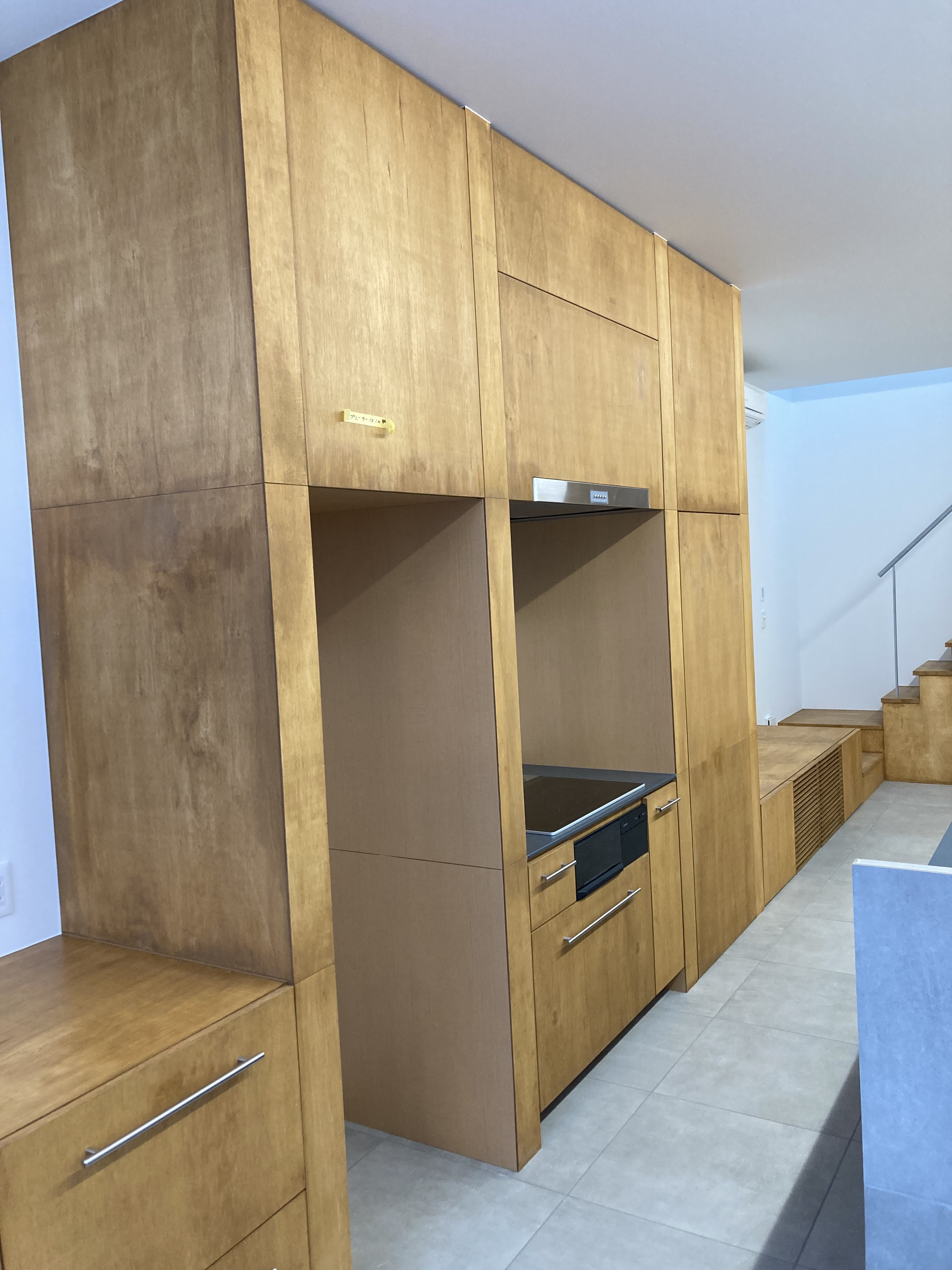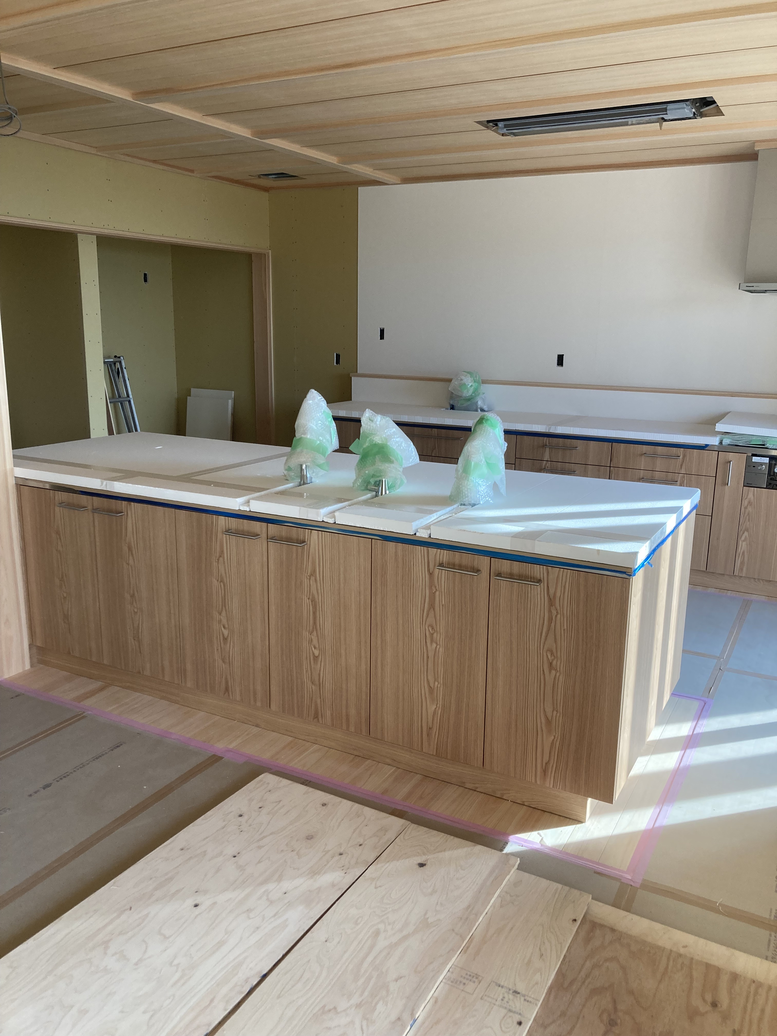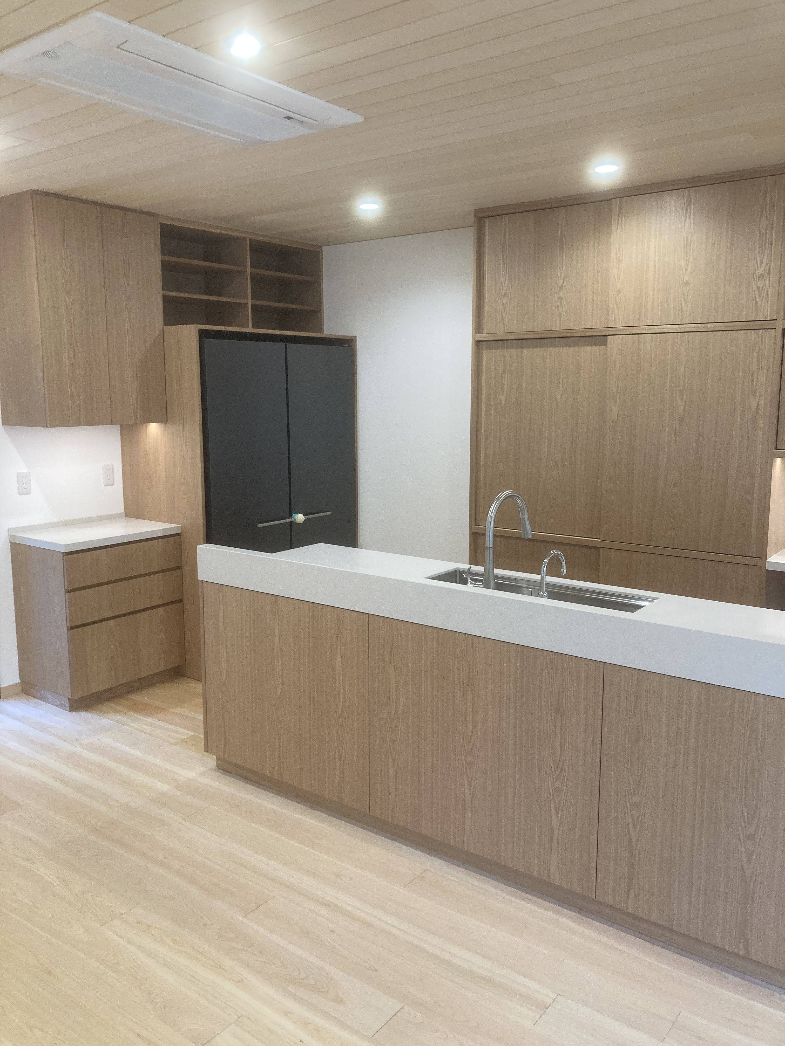 天井の木目とキッチンの面材がリンクし、木に包まれるようなキッチン