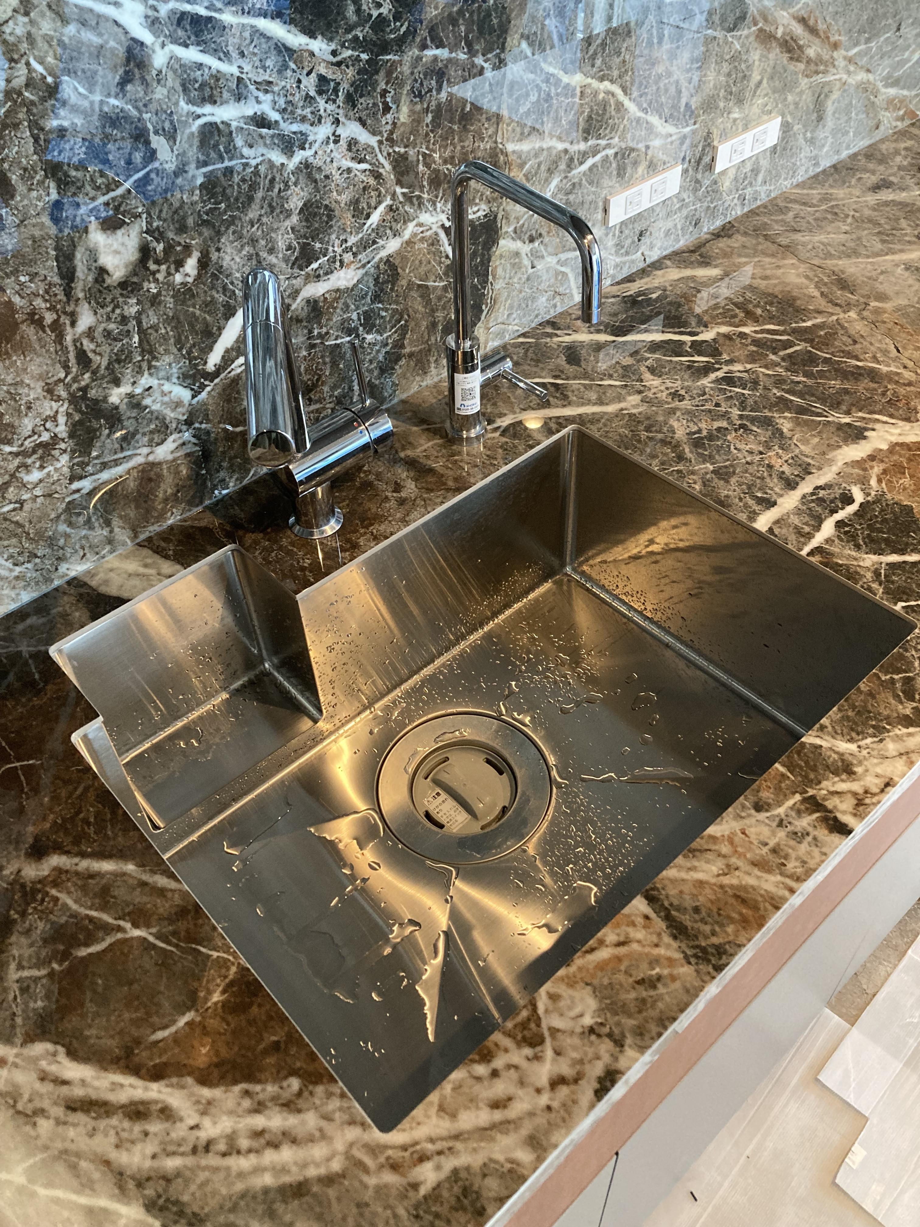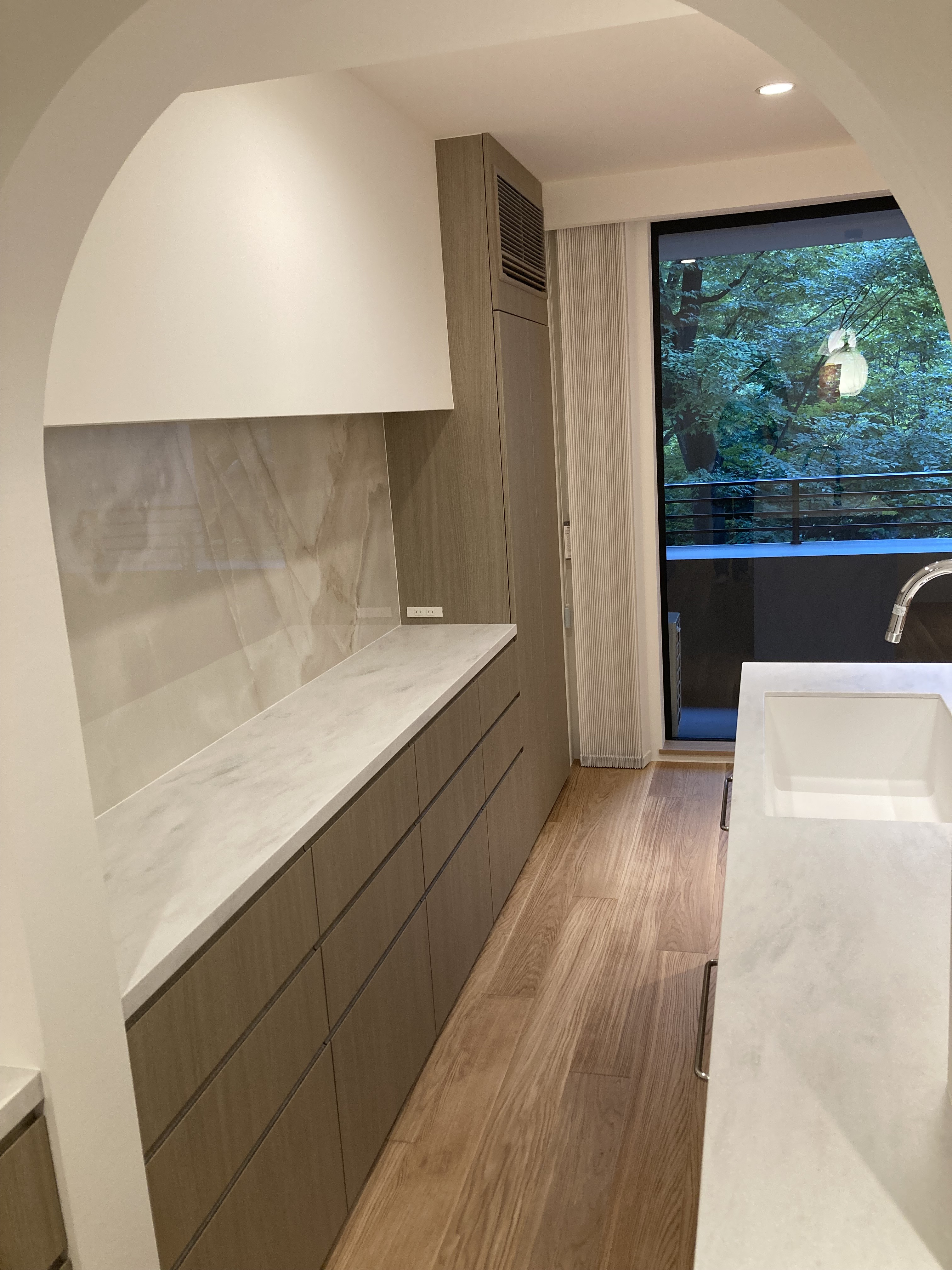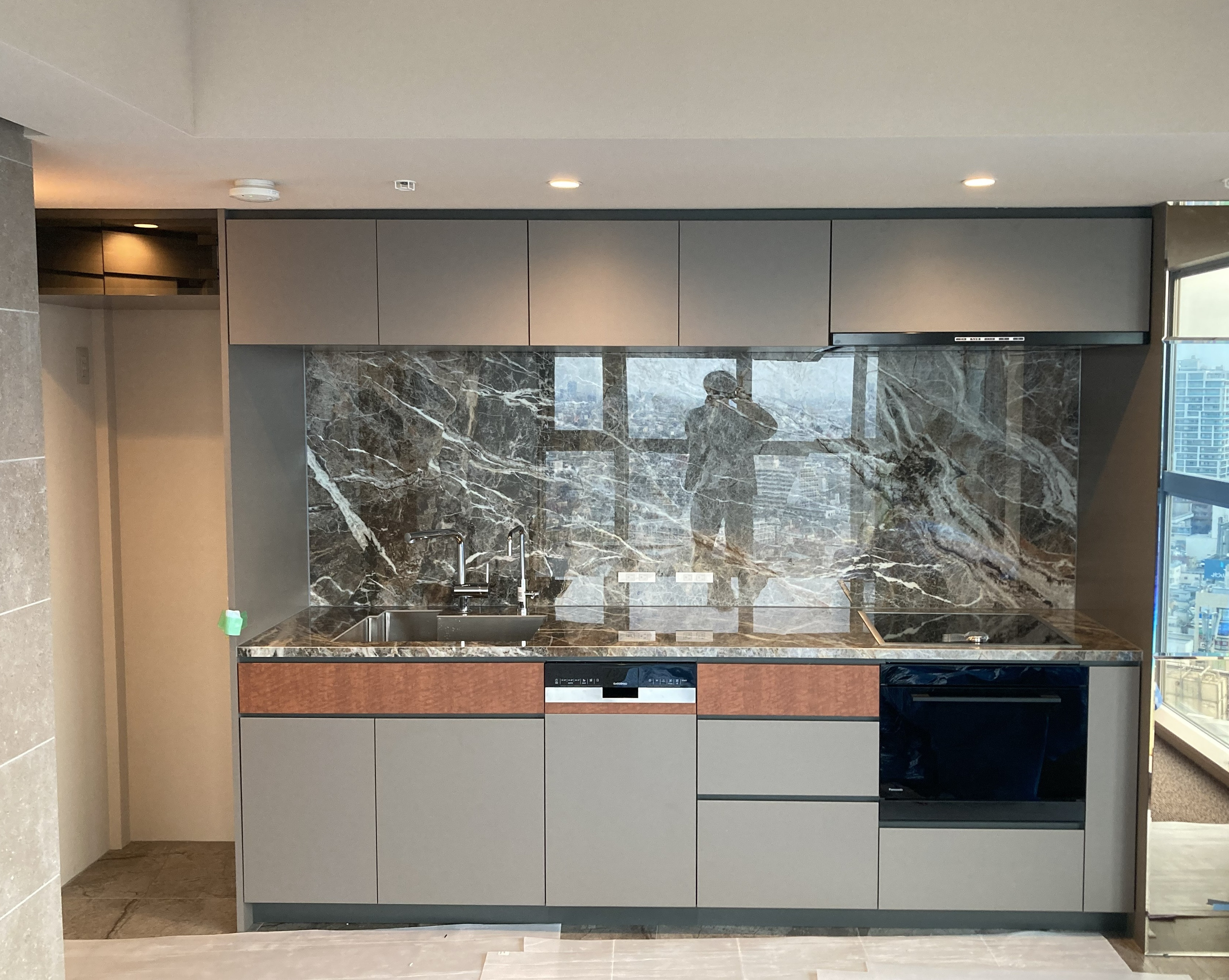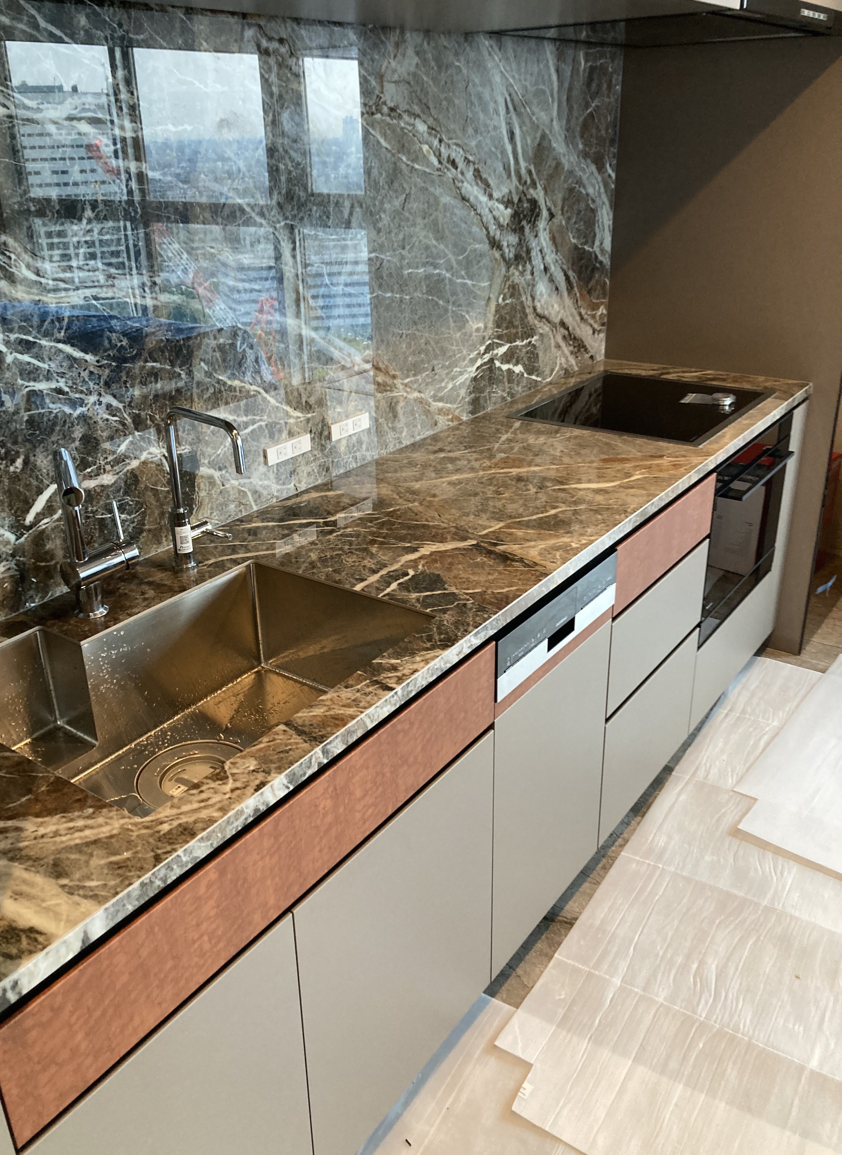 大理石をカウンターと壁面に採用した豪華で機能的なキッチン