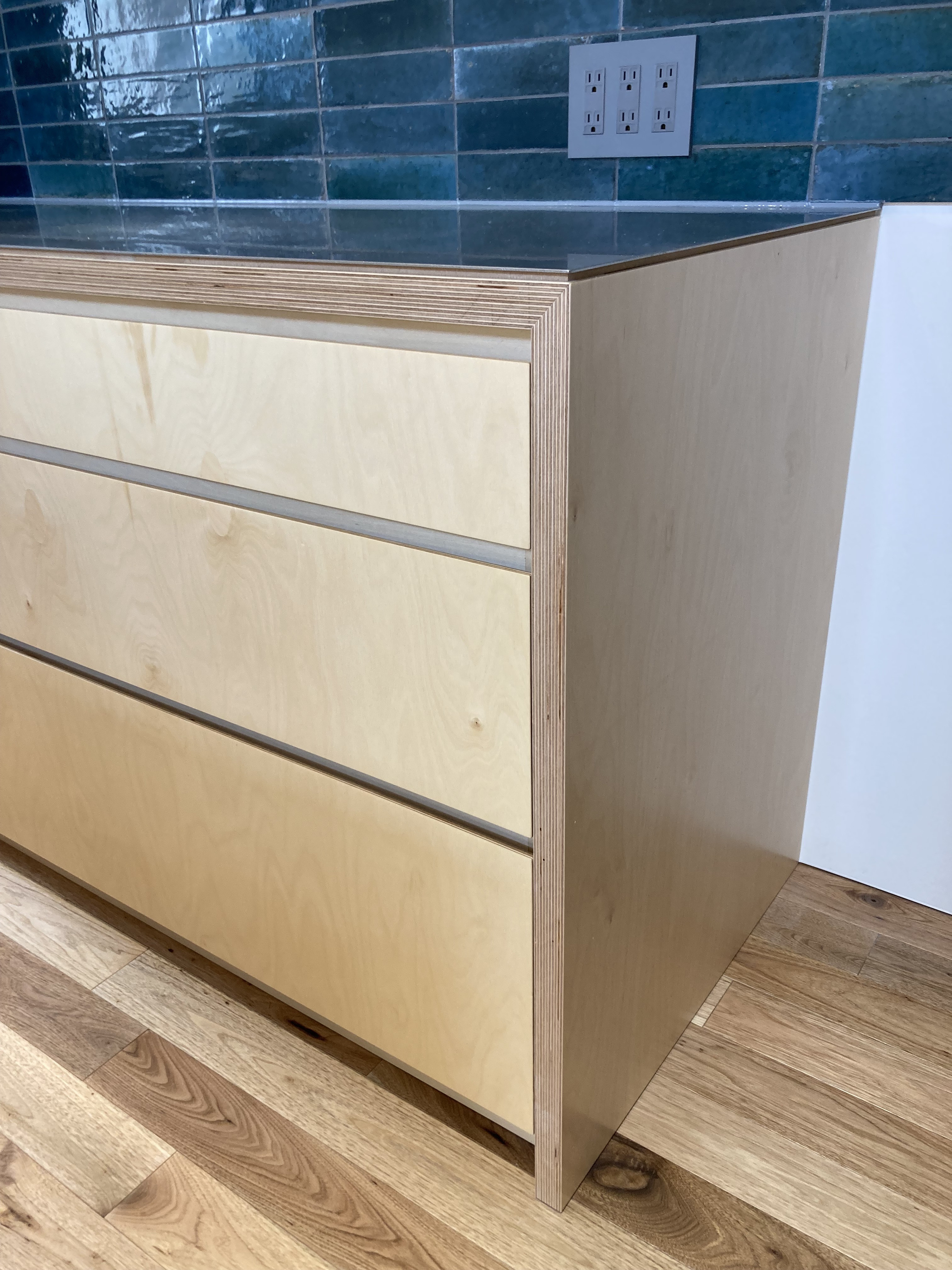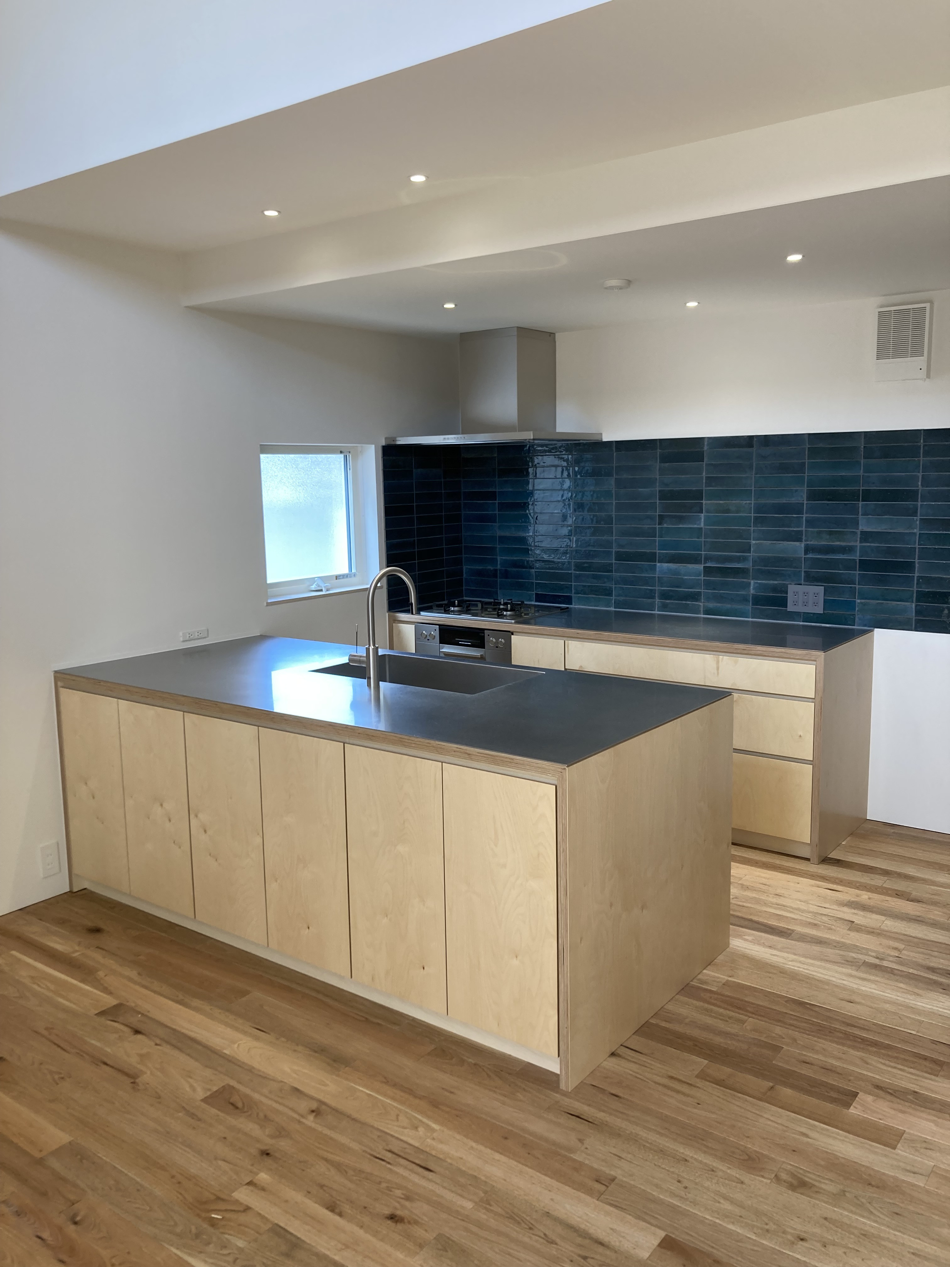 木材の自然な風合いと、光沢のある青いタイルのコントラストがおしゃれ