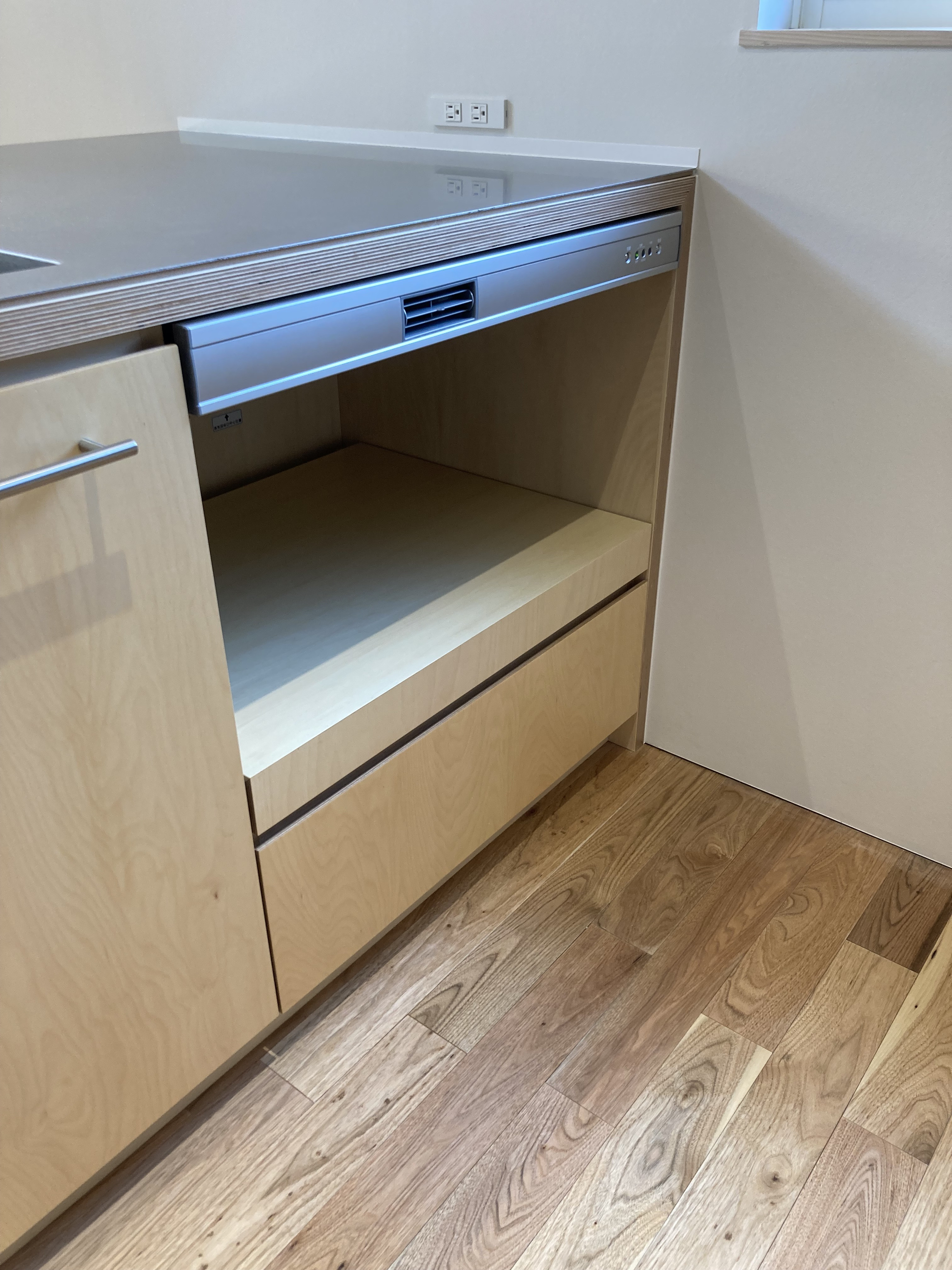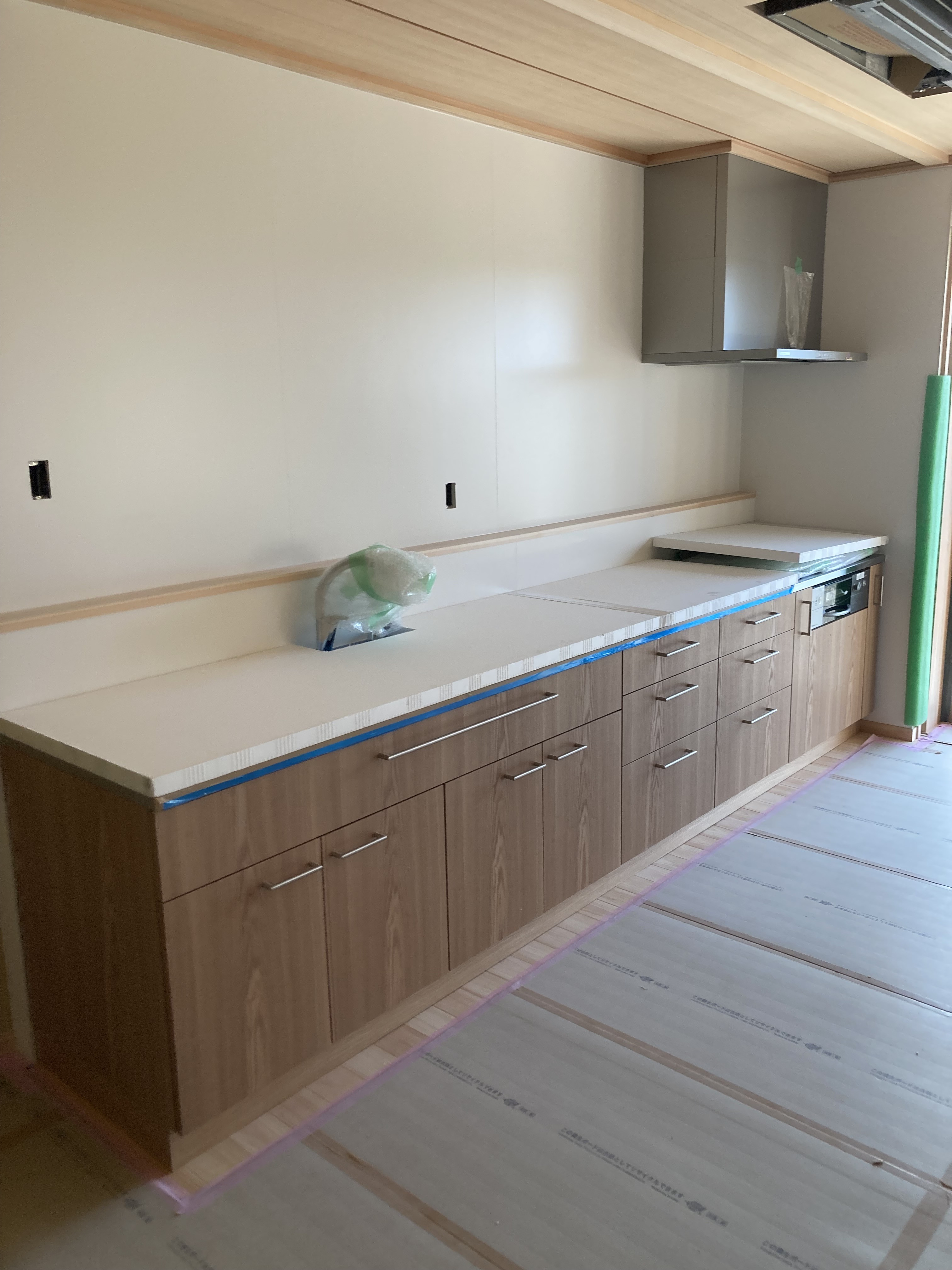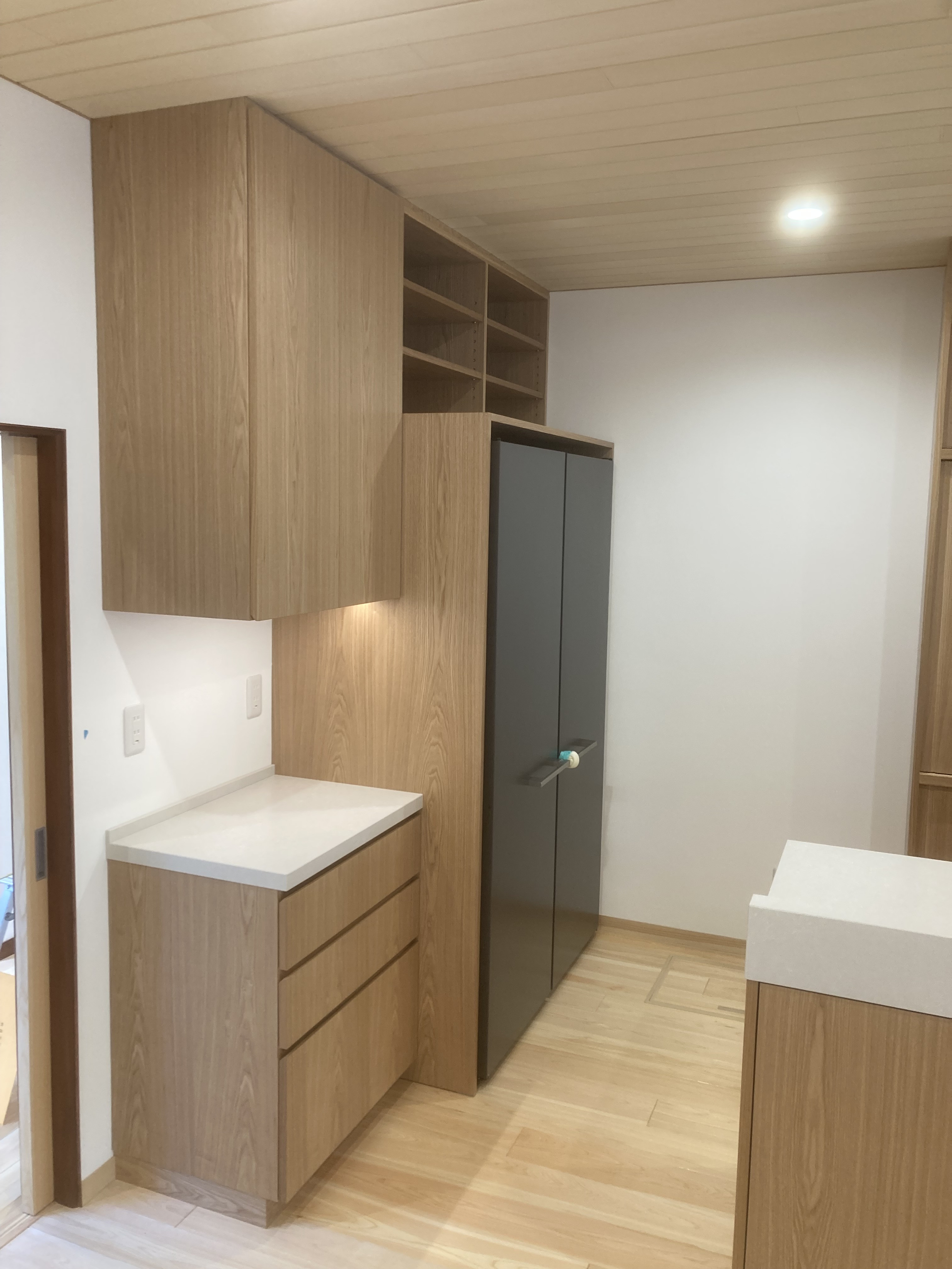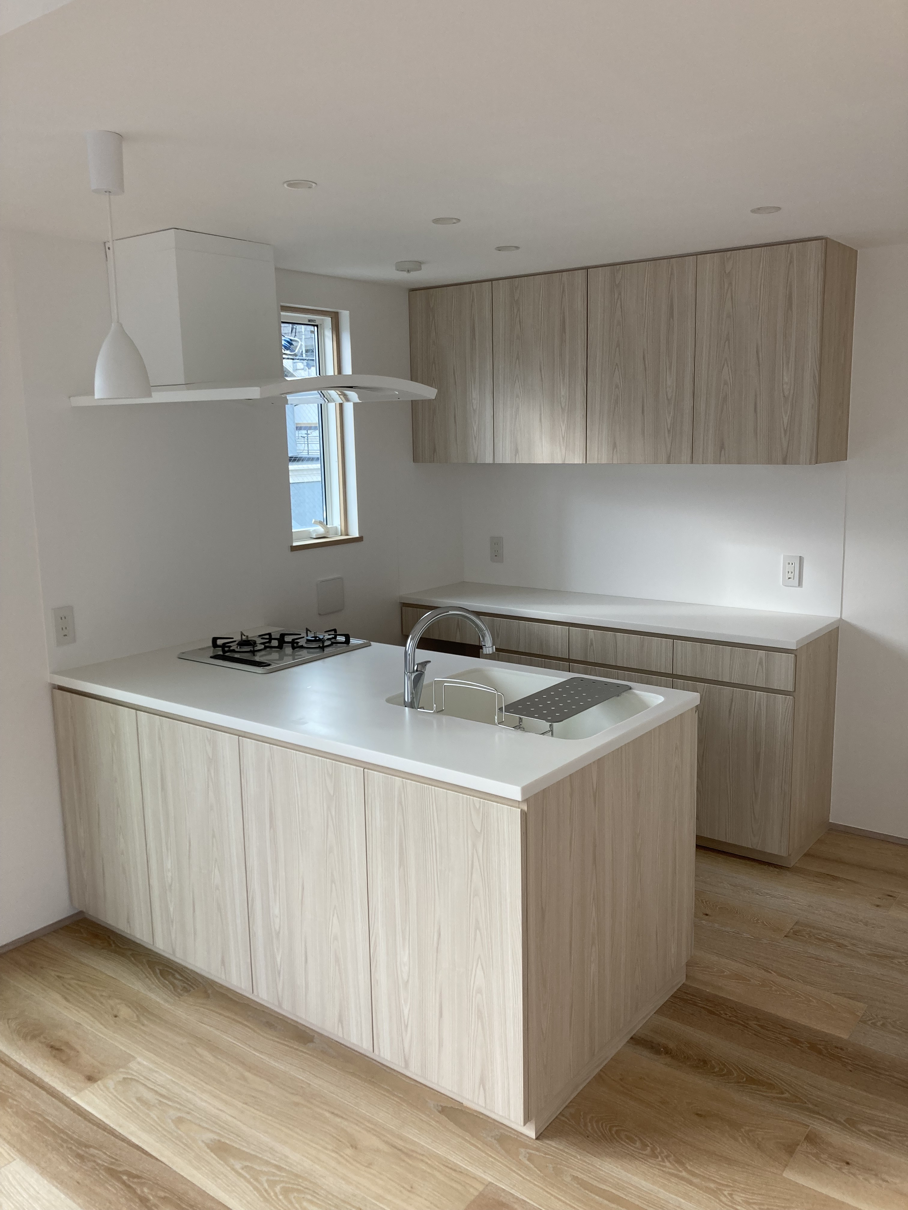 ニュアンスカラーの優しい木目調で北欧風のナチュラルモダンなキッチン